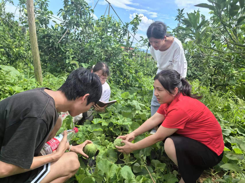 大学生在田间地头了解瓜果生长情况