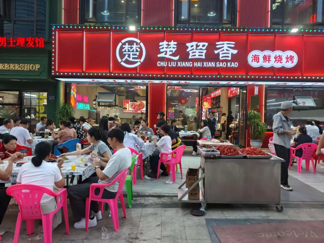 咬一串烧烤,干一杯啤酒。假期首日,安达路美食街店铺挤满了市民。1元串的烤鱼片,2元个的高压锅生蚝,一些店铺接住小长假带来的流量,纷纷推出进店消费惊爆价。店铺门前外摆夜市一桌桌,客人来了一波又一波,提前点燃了五一消费热情。