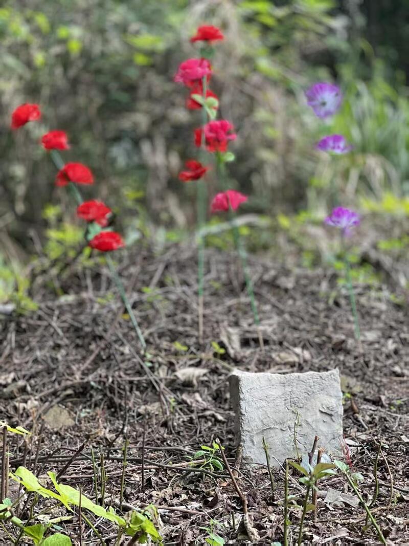 在泉塘塆一处向阳的山坡,大家停下脚步。一座不起眼的土坟前,立着一方小小的青石碑,宽约20厘米,高不过30厘米。岁月在石面蚀出深痕,但镌刻的字迹依然清晰可辨——“浙江人朱子清之墓”。坟头,两盏褪色的清明灯在微风中轻晃,几束略显陈旧的黄色坟标,昭示着不久前有人来过。