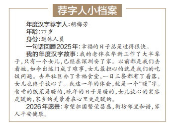 面对即将到来的2026年,胡梅芳有着朴素而温暖的期盼:“往大了说,愿祖国统一,繁荣昌盛;往中间说,盼邻里和睦,社区美好;往小了说,就希望一家人平安健康,我们老两口生活自理,不给子女添负担。”