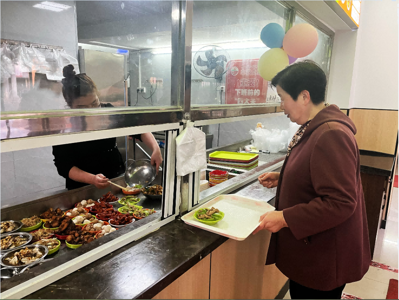 去年起,他们的生活迎来了转机。天方社区将闲置的办公场所改造升级为“幸福食堂”,开始为居民提供一日三餐。早餐有馄饨、豆浆、油条等多样选择;午晚餐则是荤素搭配、价格实惠,更贴心的是,饭菜都做得软烂适中,特别适合老年人的口味。